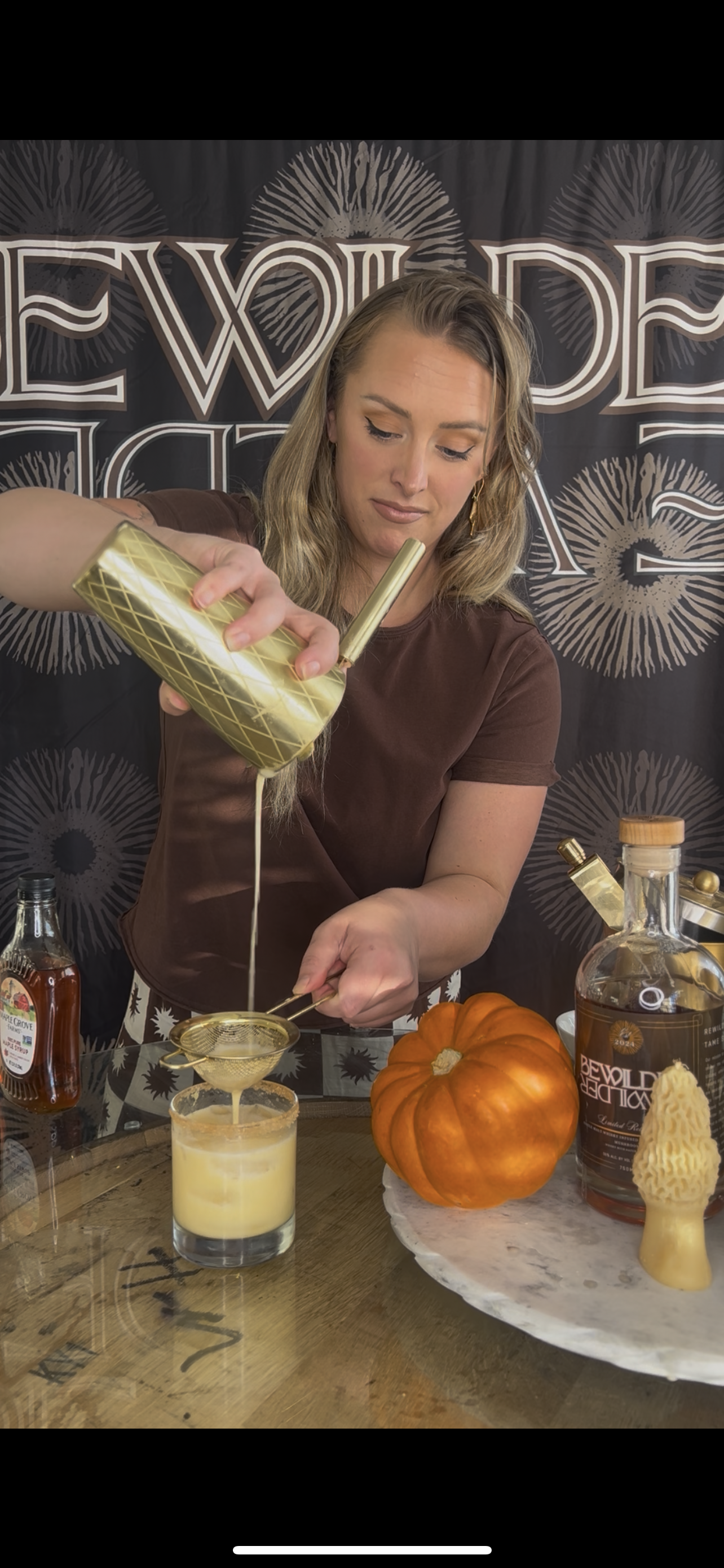 1. Build in shaker — combine Bewilder Be Wilder whiskey, maple syrup, lemon juice, pumpkin purée, egg white, and Angostura bitters into the shaker.